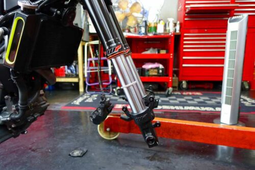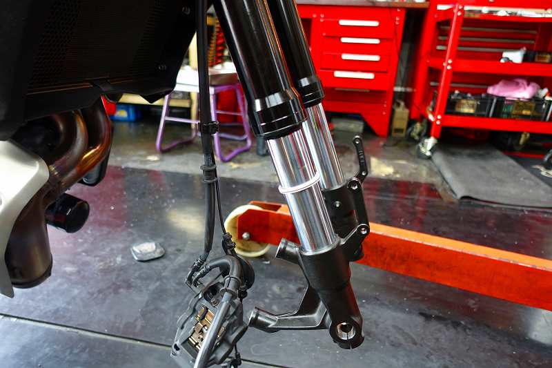 リアはOHLINSを投入予定ですが納期の関係で先ずはフロントフォ-クの健脚施工。
