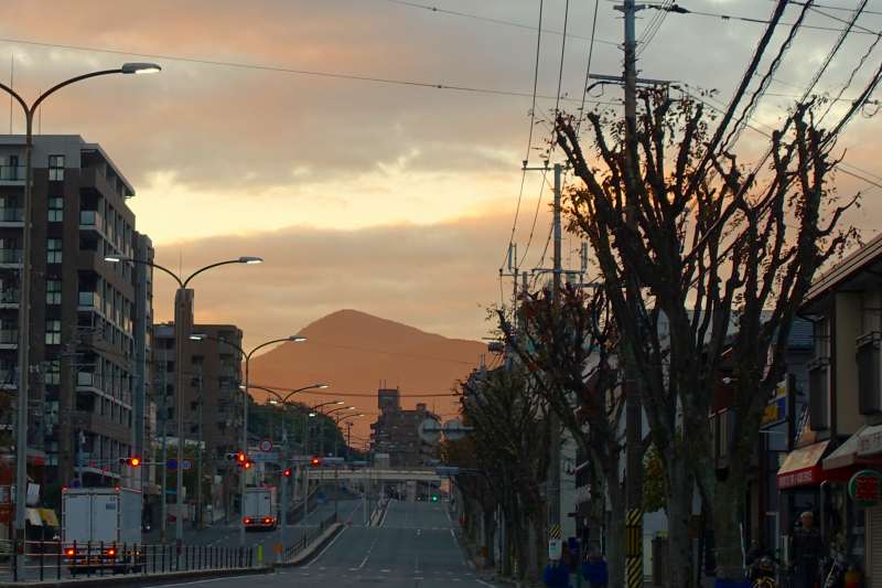 微妙な朝焼けで山が赤く見えますね~しかも何時もより大きく見えているような気がしますが・・・