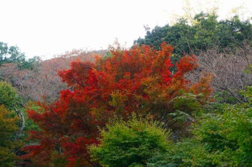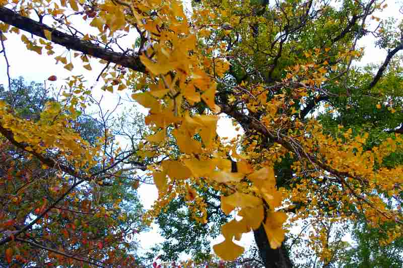 この銀杏の木から紅葉谷まで約20分ですが空が白み始め昨日と違う鮮やかな紅葉。日々彩を変える足立の森。