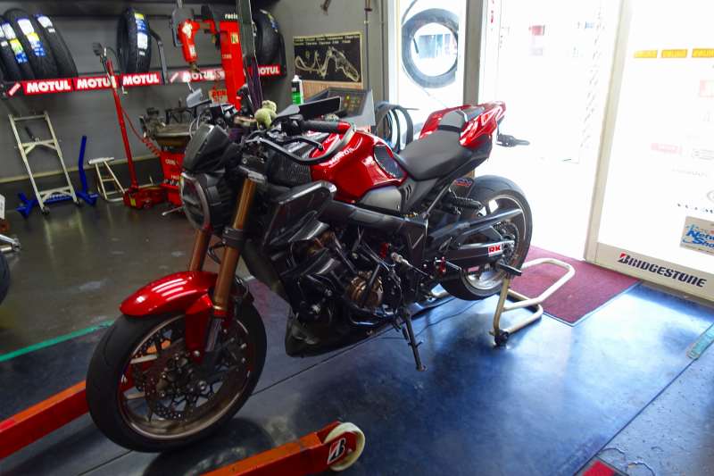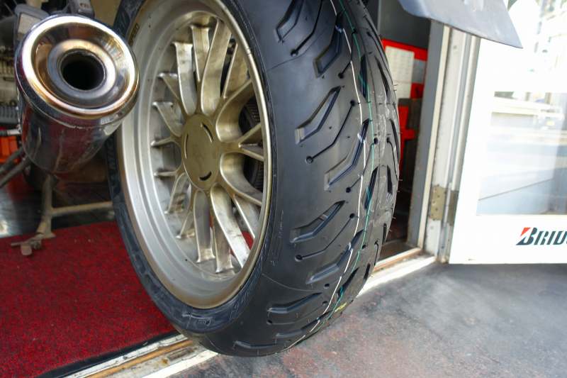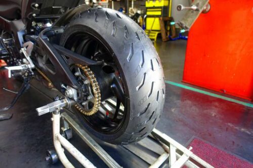 ところで今回はPOWER2CTからPOWER5への換装です。サイズ変更のご相談も承りましたがABSシステムがエラ-として感知する恐れがあるのでサイズ変更はなしという事で120/70ZR17&190/50ZR17を装着。