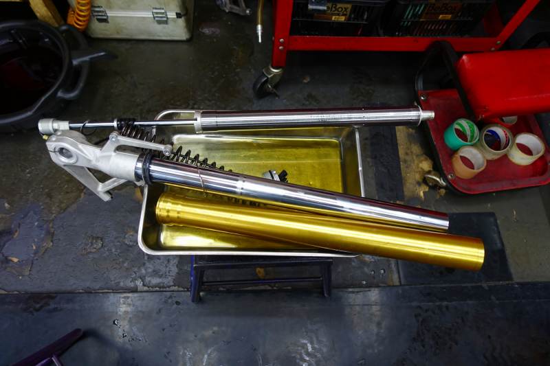 今回のチェックインはOHLINS正立フロントフォ-クの再健脚&リアOHLINSのメンテナンスです。