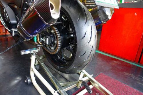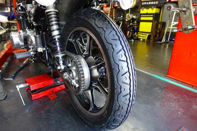 バイクのタイヤ交換作業はホイ-ルの脱着がそもそも肝であります、ご安全に!