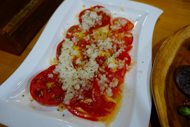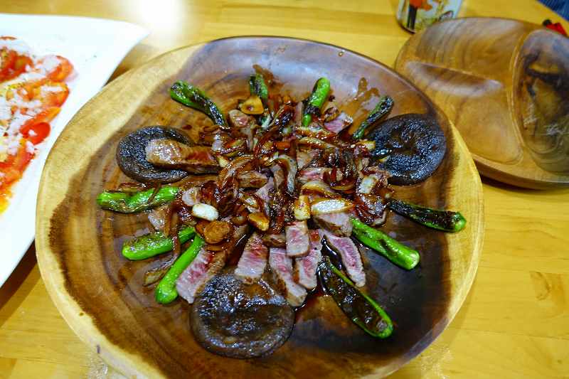この日は椎茸、しし唐を添えたガ-リックカットステ-キとトマトスライス、自家製のオニオンドレッシングが大好きなんです♪