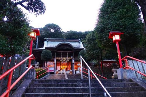 何時もはたくさん人が居るのに明け方は天気が悪かったためか境内は私一人でした。早朝の神社に明かりが灯り荘厳な雰囲気ですね。