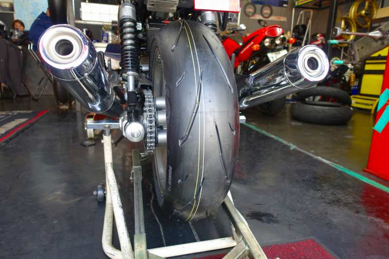 タイヤ交換前の空気圧はフロント230/リア290kpaが充填されていました。もう何が何でもって感じですね。