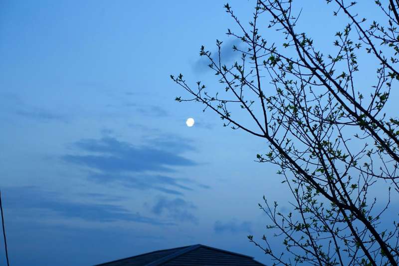 夜明けが日々早く成って来ますね、午前5時半のかわたれ時の空に浮かぶ朝行く月、風情が有りますね^^